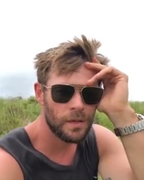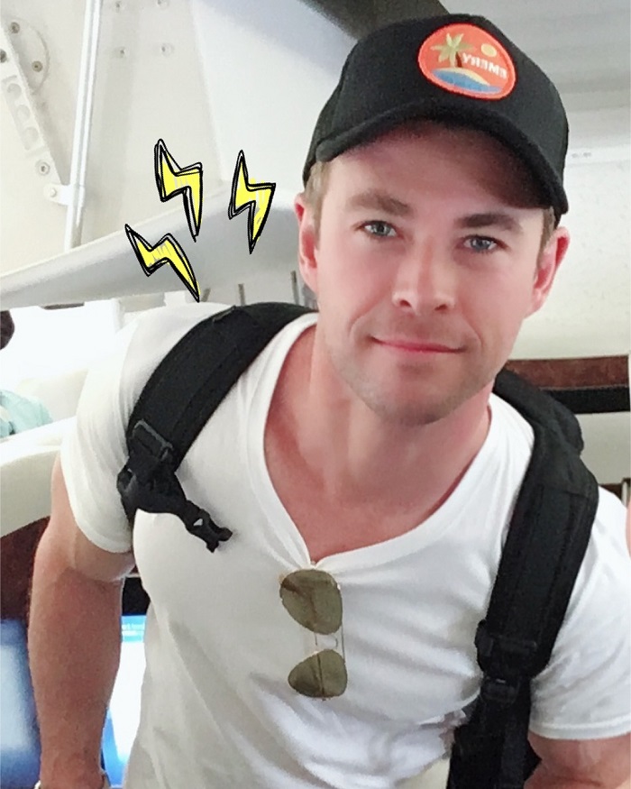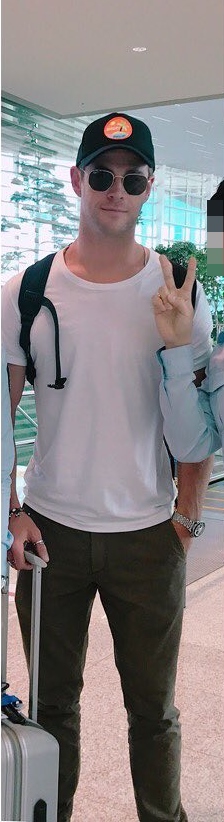 헴스워스는 공항에 있던 것으로 보이는데, 편안한 차림에 여행 가방을 들었다.