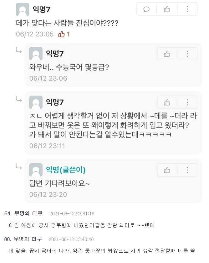 이를 본 온라인 커뮤니티 네티즌들은 “제가 공시 공부를 했는데 감탄 의미로 ‘데’를 붙이는 게 맞습니다. 방송 자막은 틀린 게 없어요.”, “이거는 다른 사람에게 관련된 것이므로 대가 맞습니다. ‘데’가 맞다고 하는 사람들은 뭐 하는 사람들인지”라는 반응을 보였다.