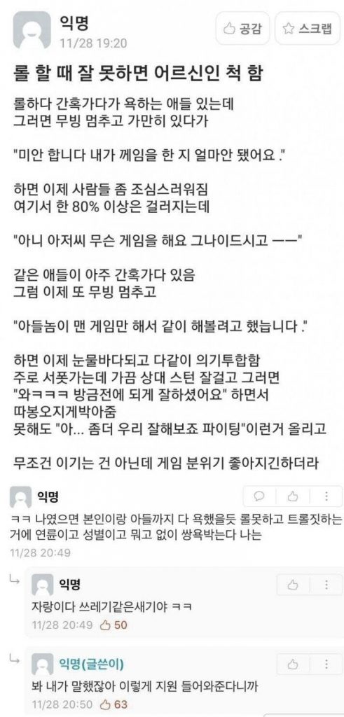 바로 롤 할때 잘 못하면 ‘어르신’인 척 하는 것. 간혹 가다가 욕하는 사람들이 있는데, 그러면 무빙을 멈추고 가만히 있다가 “미안 합니다 내가 께임을 한 지 얼마안 됐어요.” 같은 식으로 올리는 것.
