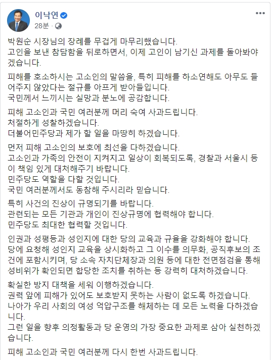 이낙연 의원은 페이스북에 올린 글에서 “국민이 느끼는 실망과 분노에 공감한다”면서 “고인(박 전 시장)을 보낸 참담함을 뒤로하면서 이제 고인이 남긴 과제를 돌아봐야겠다”고 했다.