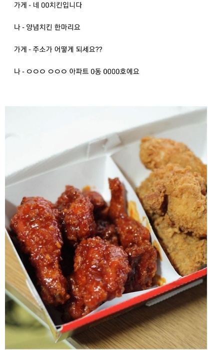 이미지에는 ‘가게- 네 00 치킨입니다. 나-양념 치킨 한마리요. 가게-주소가 어떻게 되세요? 나-000 000 000아파트 0동 000호에요’라는 대화가 담겨 있었다.