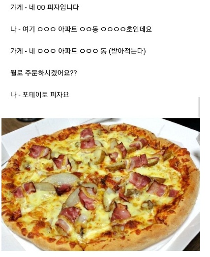 이어 또 다른 이미지에는 ‘가게-네 00피자입니다. 나-여기 000 아파트 00동 000호인데요. 가게- 네 000 아파트 00동 (받아적는다) 뭘로 주문하시겠어요? 나-포테이토 피자요’라는 대화가 있었다.