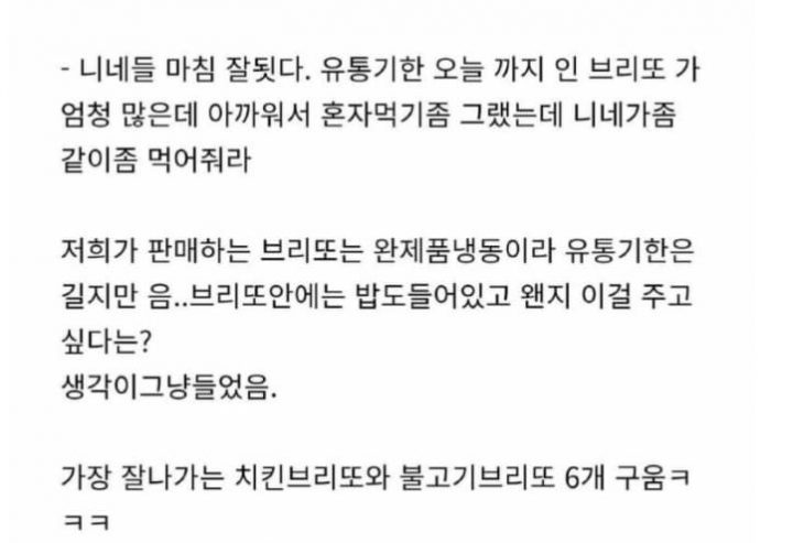 이러한 아이들의 행동에 가게 주인은 눈치를 채고 아이들에게 뭐라도 줘야겠다는 생각에 “니네들 마침 잘됐다. 유통기한 오늘까지인 브리또가 엄청 많은데 아까워서 혼자 먹기 좀 그랬는데 니네가 좀 같이 좀 먹어줘라”며 아이들에게 가장 잘 나가는 치킨브리또와 불고기브리또 6개를 구워줬다고 말했다.