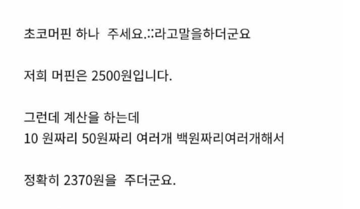 이에 “머핀은 2500원이고 돈을 받고 계산을 하는데 10원짜리 50원짜리 여러개 백원짜리 여러개 해서 정확히 2370원을 주더라”고 말했다.