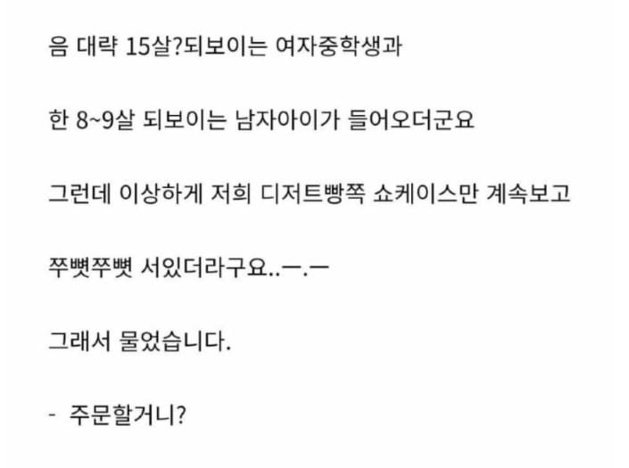 빵집 자영업자는 “대략 15살 되어 보이는 여자 중학생과 한 8~9살 되어 보이는 남자아이가 들어오더군요. 그런데 이상하게 저희 디저트빵 쪽 쇼케이스만 계속보고 쭈뼛쭈볏 서있더라구요”라고 말했다.