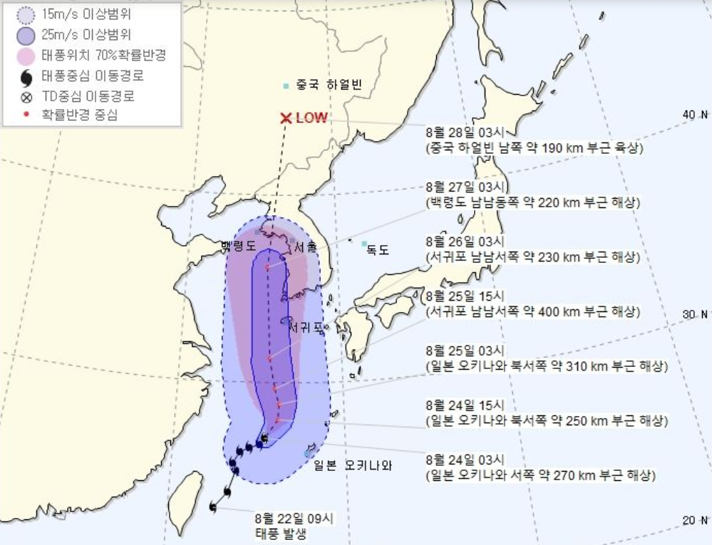 태풍이 북상하면서 지리산 부근과 제주도에는 100~300mm가량의 큰 비가 내릴 예정이고 제주 산지에서 최대 500mm가량의 폭우가 내릴 전망으로 보인다.
