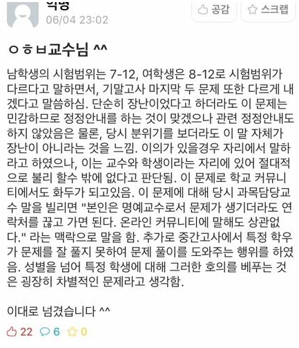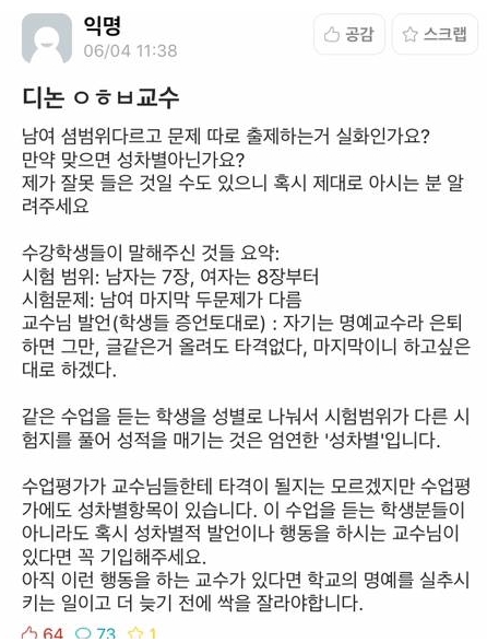 A씨는 남성과 여성 시험 범위가 다르고 문제도 다르다”며 “남자는 시험 범위가 7~12P, 여자는 8~12P다”라고 말했다. 그러면서 그는 “교수님은 자기가 명예교수이기에 은퇴하면 그만이다”라며 “글 같은 거 올려도 타격 없으니 마지막이니 하고 싶은 대로 하겠다”고 현실을 고발했다.