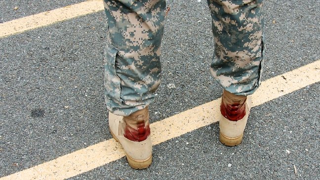 이 미군은 입대 이후 처음 행군 훈련을 하던 중 길이 들지 않는 전투화 때문에 뒤꿈치가 완전히 벗겨져 상처를 입었다.