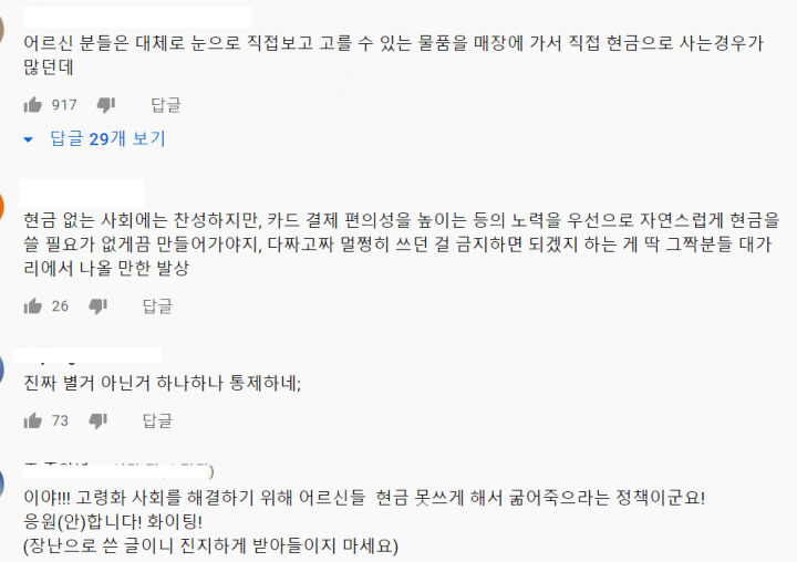 해당 소식을 접한 국민들은 “점차 고령화되고 있는 사회에 할머니 할아버지들은 어떡하란 말이냐?”, “현금을 못 쓴다고??..”, “내가 현금을 내고 물건을 사겠다는데 왜 그러지?”등 정 전 총리의 발언에 부정적인 반응을 보였다.
