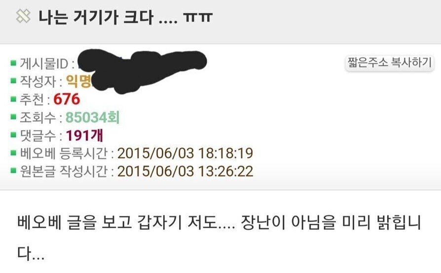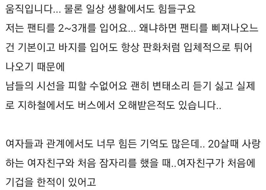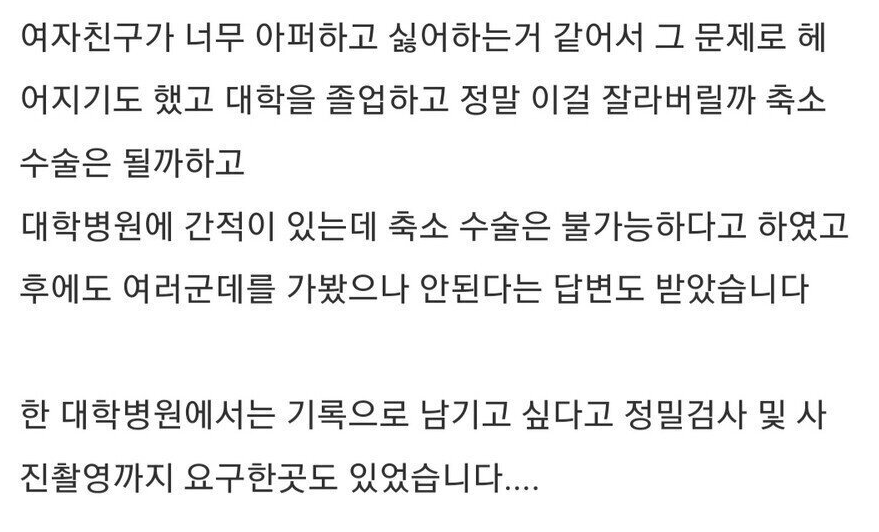 이어 “대학병원에 갔는데 축소 수술은 불가능하다고 했고, 한 대학병원에서는 기록으로 남기고 싶다며 정밀검사 및 사진촬영까지 요구했다”고 폭로했다.
