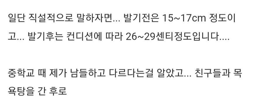 A 씨는 “직설적으로 말하면 발기 전 15~17cm 정도이고, 발기 후에는 컨디션에 따라 26~29cm 정도다”라고 말했다.