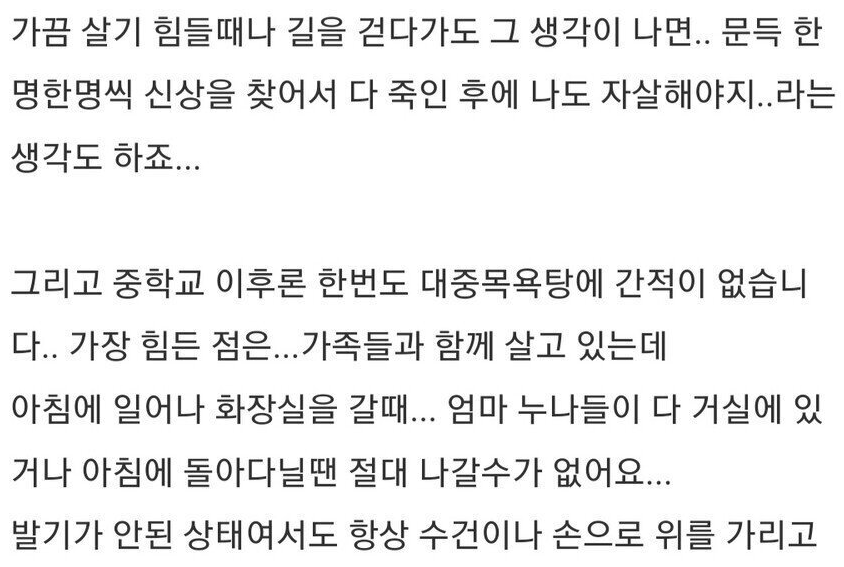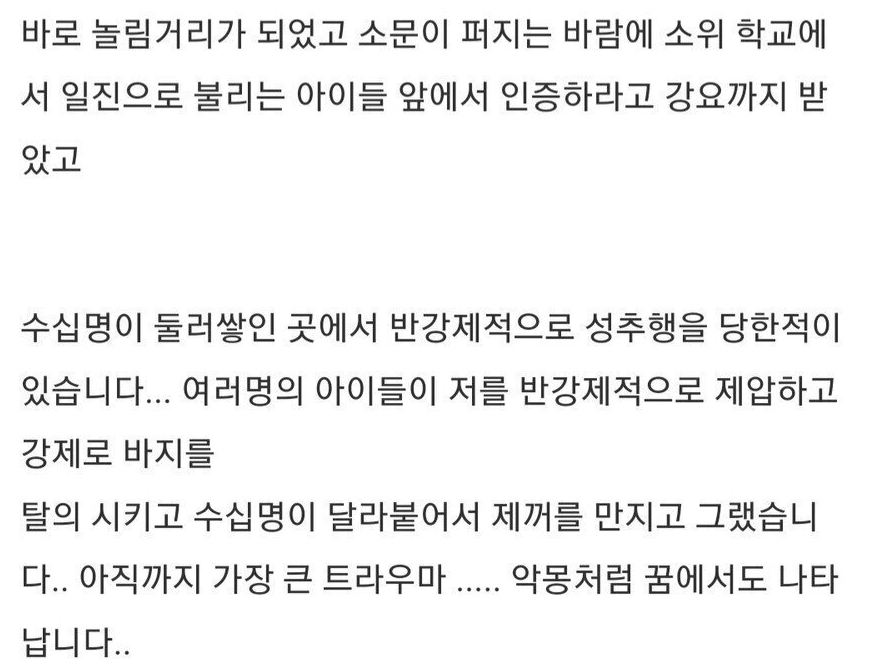 이어 “중학교 떄부터 남들과 다르다는 것을 알았고, 친구들 사이에서 놀림감이 됐다. 여러 사람에게 둘러싸여 성희롱을 당한 적도 있다”고 설명했다.