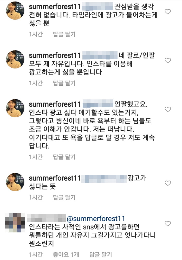 관심받을 생각이 없고 그저 “타임라인에 광고가 들어차는 게 싫을 뿐”이라고 계속해서 주장하는 장 기자는 자신에게 욕을 하는 사람들이 이해가 가지 않는다며 언팔한다는 글을 남겼다.