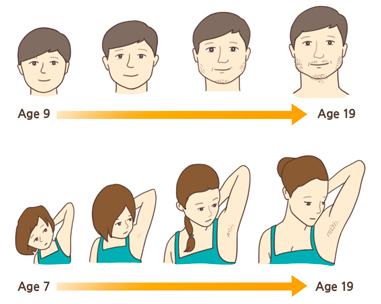 대개 남성은 11~13세(초5~중1), 여성은 10~12세(초4~초6) 전후로 시작해서 15~18세(중3~고2) 사이에 끝나지만 사람마다 인격과 성격의 변화는 서로 다르고, 2차 성징의 시작 시기는 여자가 남자보다 이르며, 사람마다 개인차가 있다.