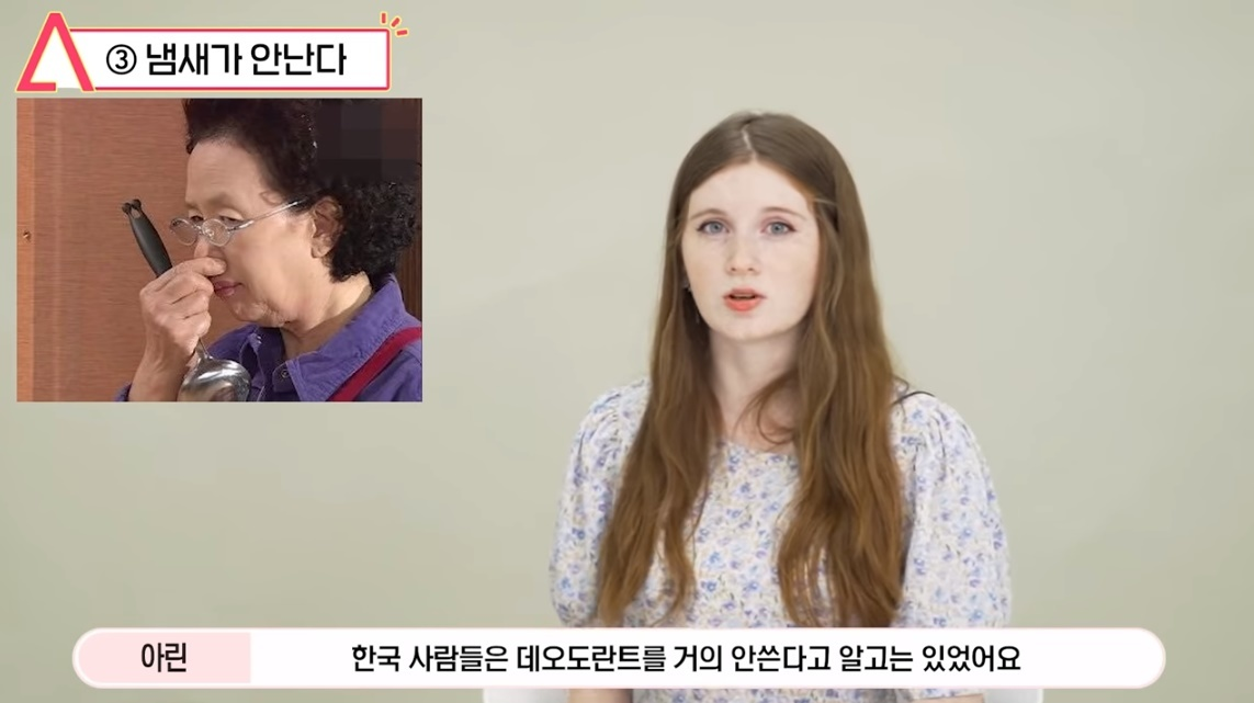 외국에서는 데오드란트를 뿌리는 것은 일상이며, 만약 뿌리지 않는다면 냄새가 많이 나며 이는 예의가 없는 행동이라고 말했다.