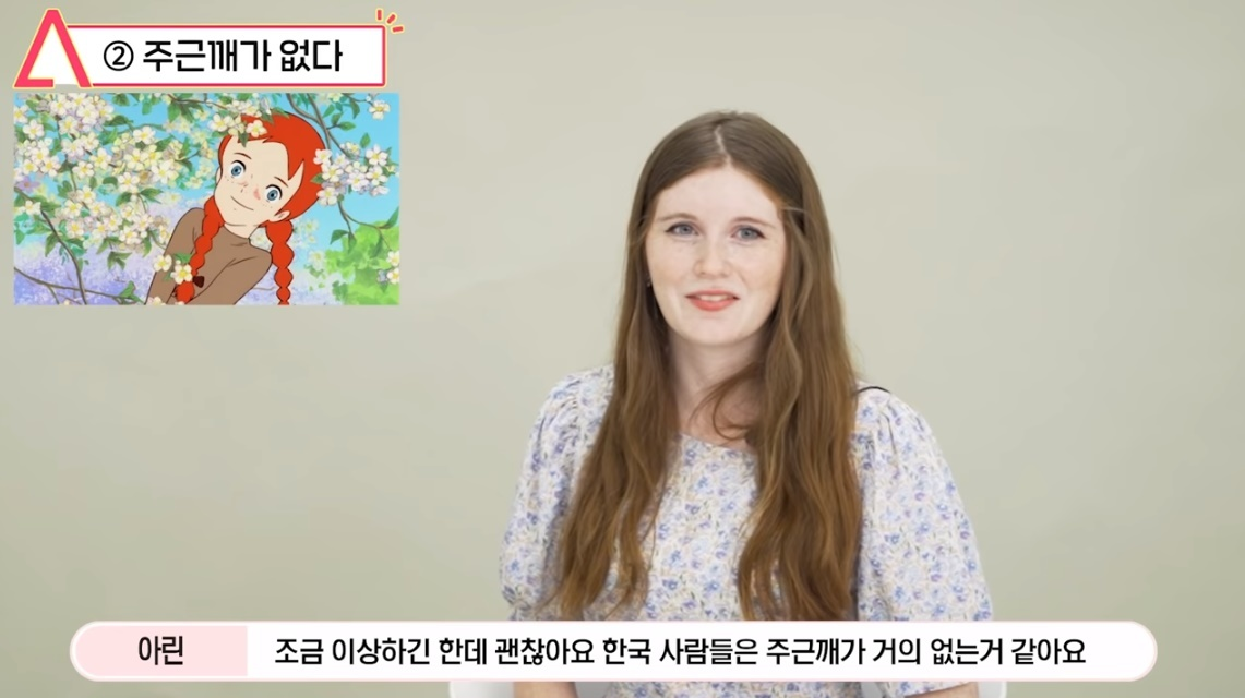 주근깨가 없는 한국인들을 신기해하며, 자신의 주근깨가 전혀 부끄럽지 않고 자연스러운 것이라 얘기했다.