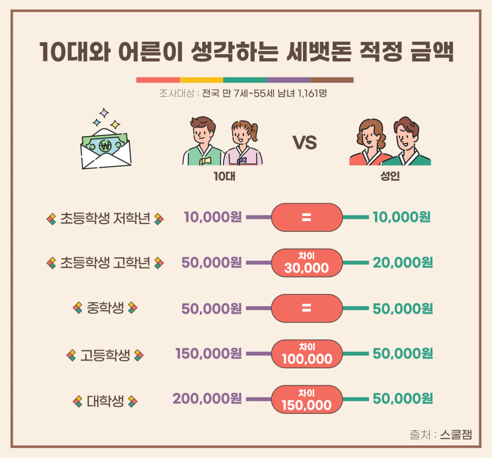 중학생 역시 5만원으로 10대와 어른들 모두 같은 금액으로 응답했다.