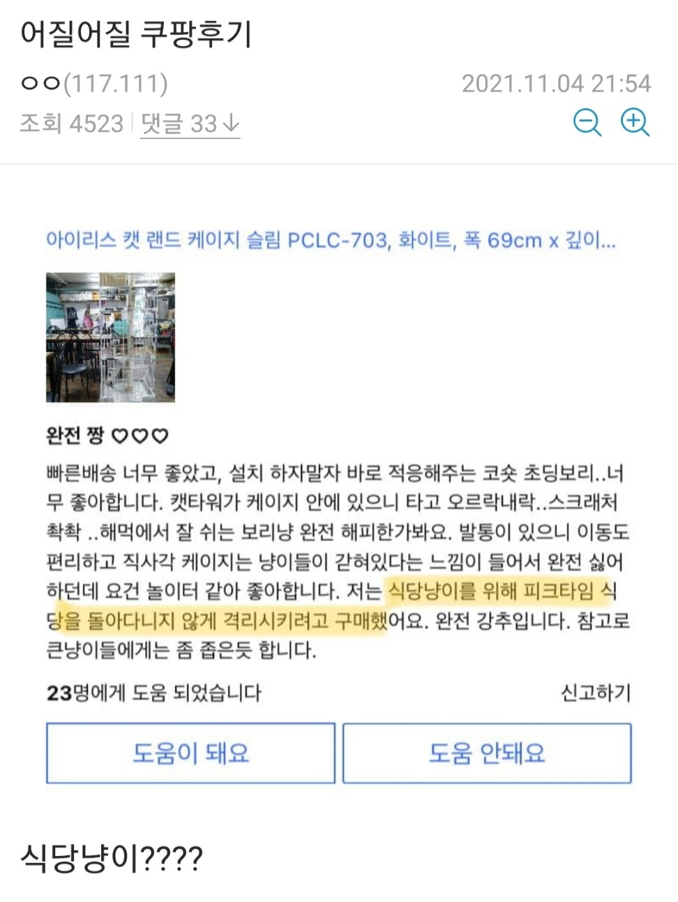 켓 케이지를 구매한 소비자는 “배송이 너무 빨라서 좋았고, 설치하자마자 고양이들이 너무 좋아해서 마음에 쏙 들었습니다.”라며 이야기를 시작했다.