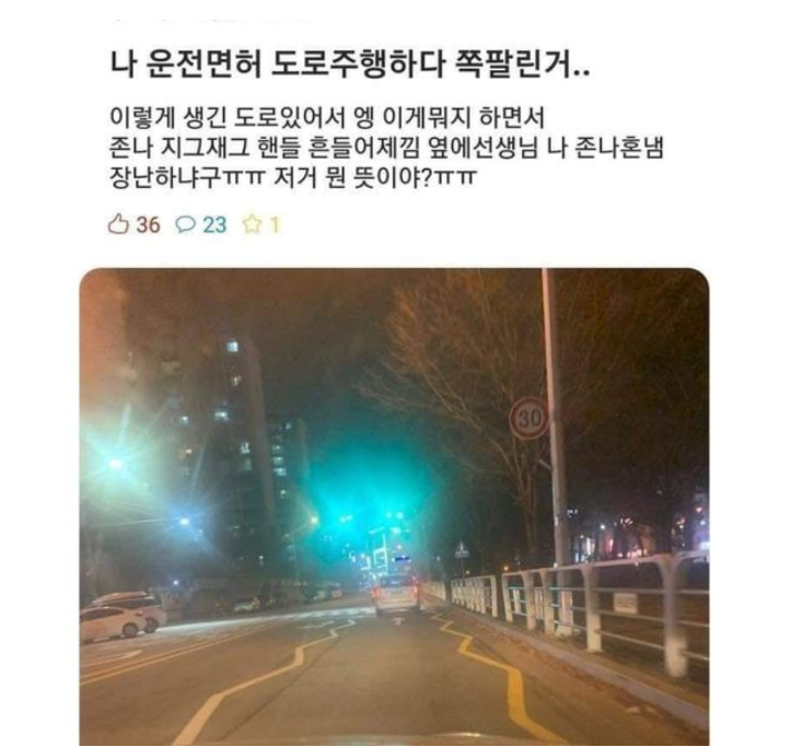 해당 글에는 도로의 사진이 올라와있고 글쓴이는 “이렇게 생긴 도로 있어서 엥 이게 뭐지 하면서 존나 지그재그 핸들 흔들어제낌 옆에 선생님 나 존나 혼냄 장난하냐구ㅠㅠ저거 뭔 뜻이야?ㅜㅜ” 라며 자신의 경험담을 올렸다.
