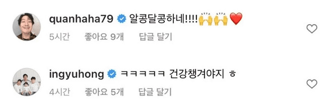 가수 하하는 “알콩달콩하네!!”라고 댓글을 달았고, 개그맨 홍인규는 “ㅋㅋㅋㅋㅋ건강 챙겨야지”라 웃음을 보였다.