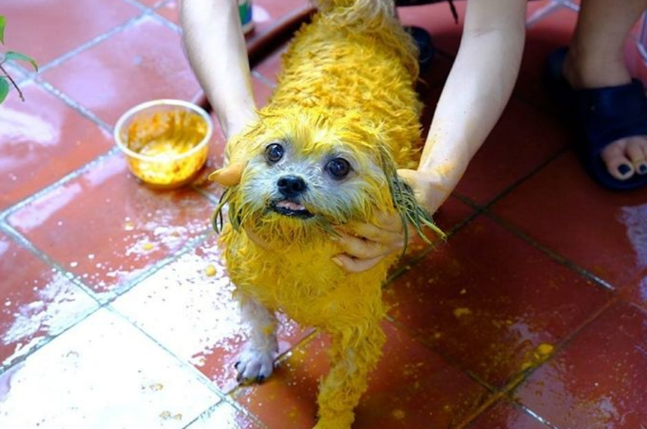알고보니 그녀가 강아지에게 발라준 것은 염색약이 아닌 노란 ‘강황가루’로 만든 피부약이었다.