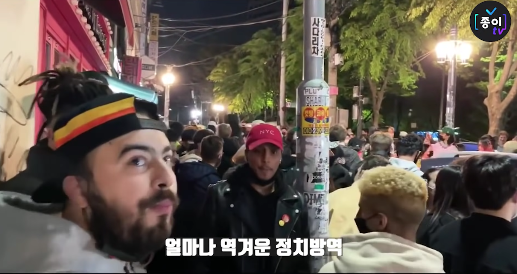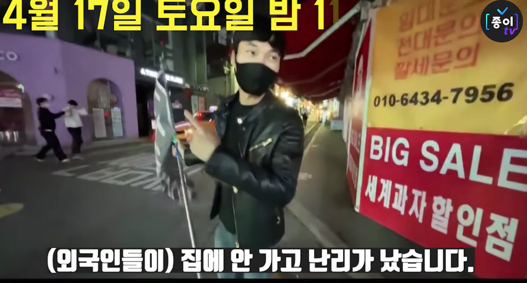 해당 영상을 보면 유튜버 종이는 이날 홍대 거리를 걷다가 영업제한 시간인 오후 10시가 넘어 많은 시민과 외국인이 홍대 거리에 나와 있었다.