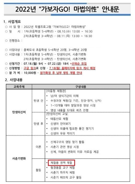 충북청소년종합진흥원의 청소년성문화센터는 ‘가보자GO! 마법의性성’ 보도자료를 통해 충북도내 초등학생 3·4학년 20명, 5·6학년 20명 각각을 대상으로 사춘기 때 겪을 수 있는 2차 성징에 대한 교육을 진행한다 밝혔던 내용이다.