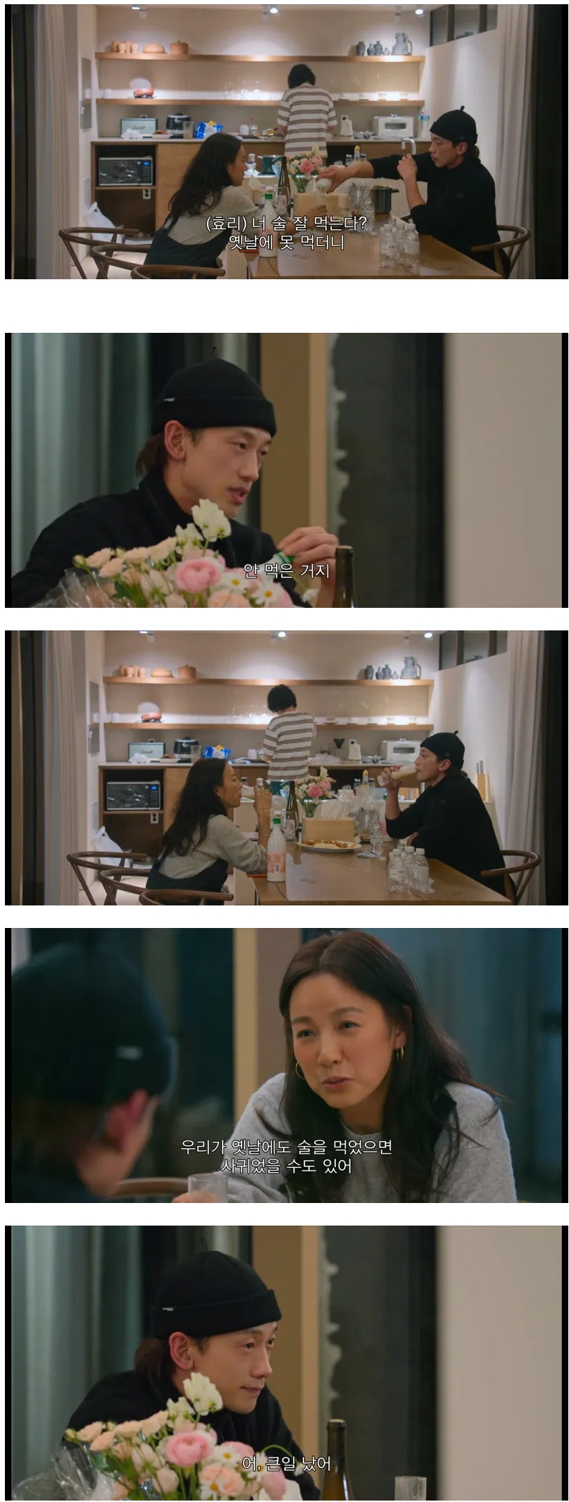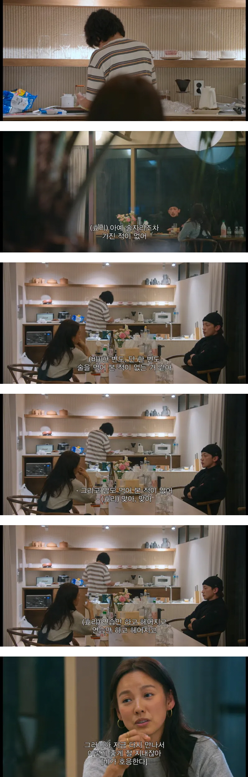 방송인 이효리는 “우리가 옛날에도 술을 먹었으면 사귀었을 수도 있어”라고 말하자 방송인 비는 “그런데 한 번도, 단 한 번도 술을 같이 먹어 본 적이 없는 것 같아.”라고 답했다.