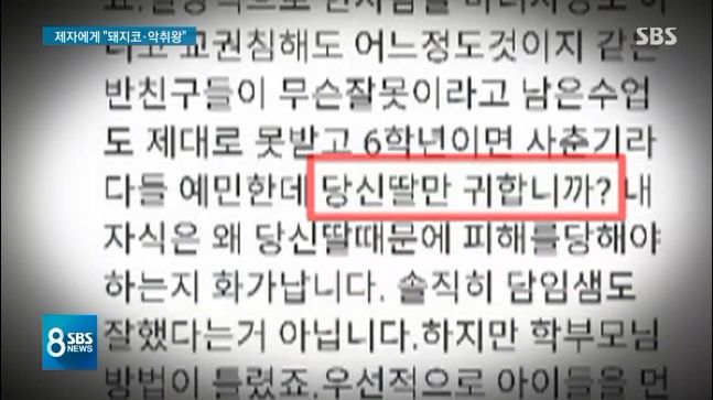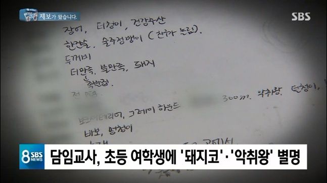 과거 SBS 뉴스 보도에 의하면 초6 담임교사가 자신의 반 학생에 비정상적인 별명을 붙여 불렸다고 한다.