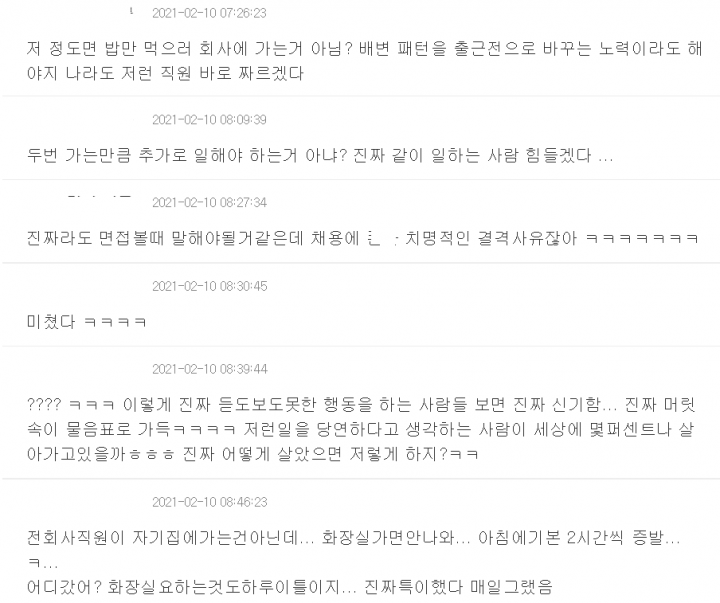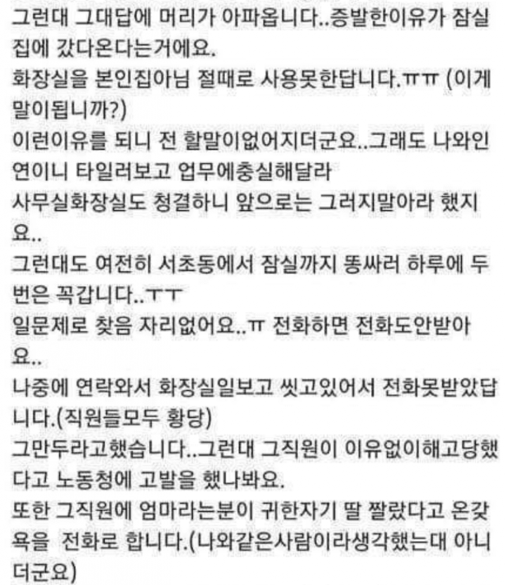 각종 온라인 커뮤니티에는 “근무시간에 대변 본다고 집 다녀오는 직원”이라는 제목의 사연이 재조명됐다.