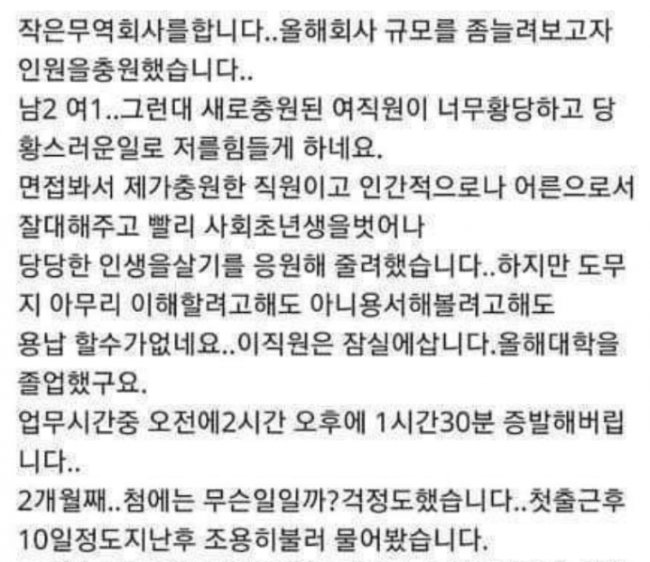 A씨가 올린 해당 글에 따르면 A씨는 작은 무역회사를 운영중이며, 새로 뽑은 여직원 B씨의 황당한 행동에 고민중이라는데 그 고민의 내용은 B씨가 업무시간 중 오전에 2시간, 오후에 1시간 30분 가량의 긴 시간 동안 자리를 비우기 때문이다.