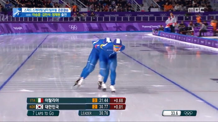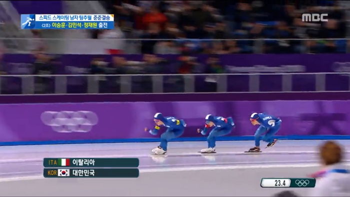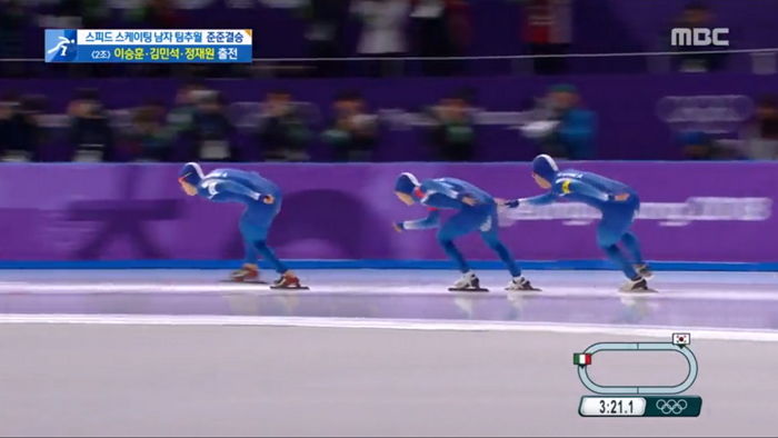 이날 준준결승 2조에서 이탈리아(3분41초64)와 경기를 치른 대표팀은 경기 시작과 동시에 ‘1500미터 동메달의 주인공’ 김민석이 맨 앞에서 팀을 이끌었고, ‘대표팀 맏형’ 이승훈과 ’17살 막내’ 정재원이 돌아가면서 선두에서 팀을 이끌게 됐다.