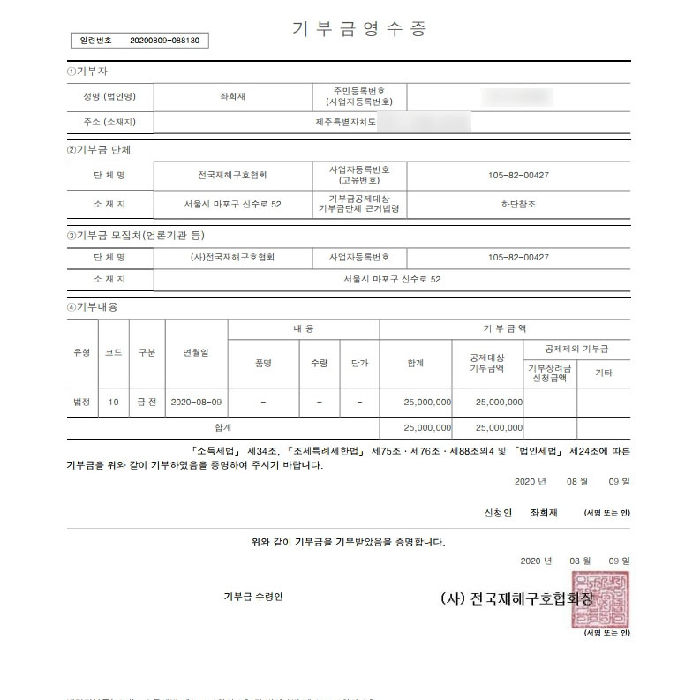 그러면서 ‘전국재해구호협회’ 기부금 영수증을 공개했다.