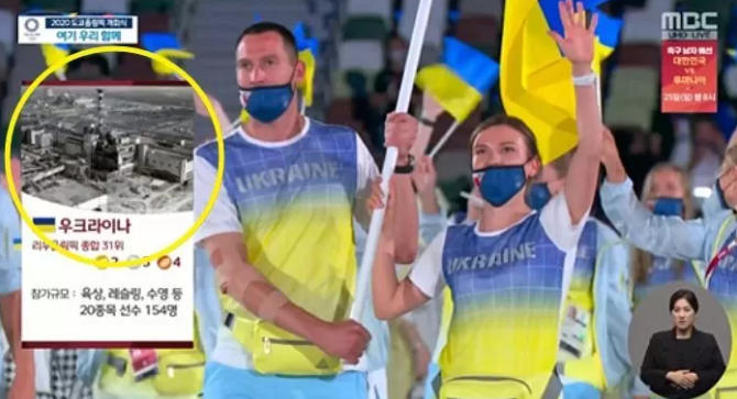 해당 장면은 우크라이나 선수단이 입장하는 순간을 담았는데, MBC는 체르노빌 원자력 발전소를 자료 사진으로 함께 송출했다.