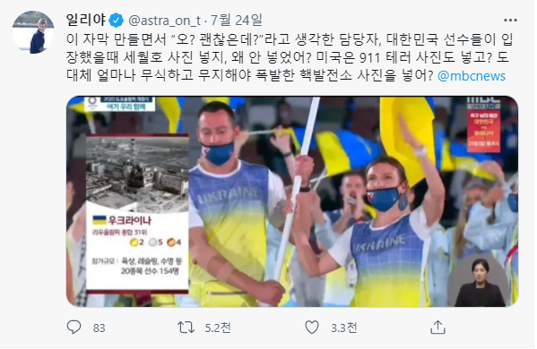 일리야는 해당 사진과 함께 “이 자막 만들면서 ‘오? 괜찮은데?’라고 생각한 담당자, 대한민국 선수들이 입장했을 때 세월호 사진 넣지. 왜 안 넣었어?”라고 강하게 비판했다.