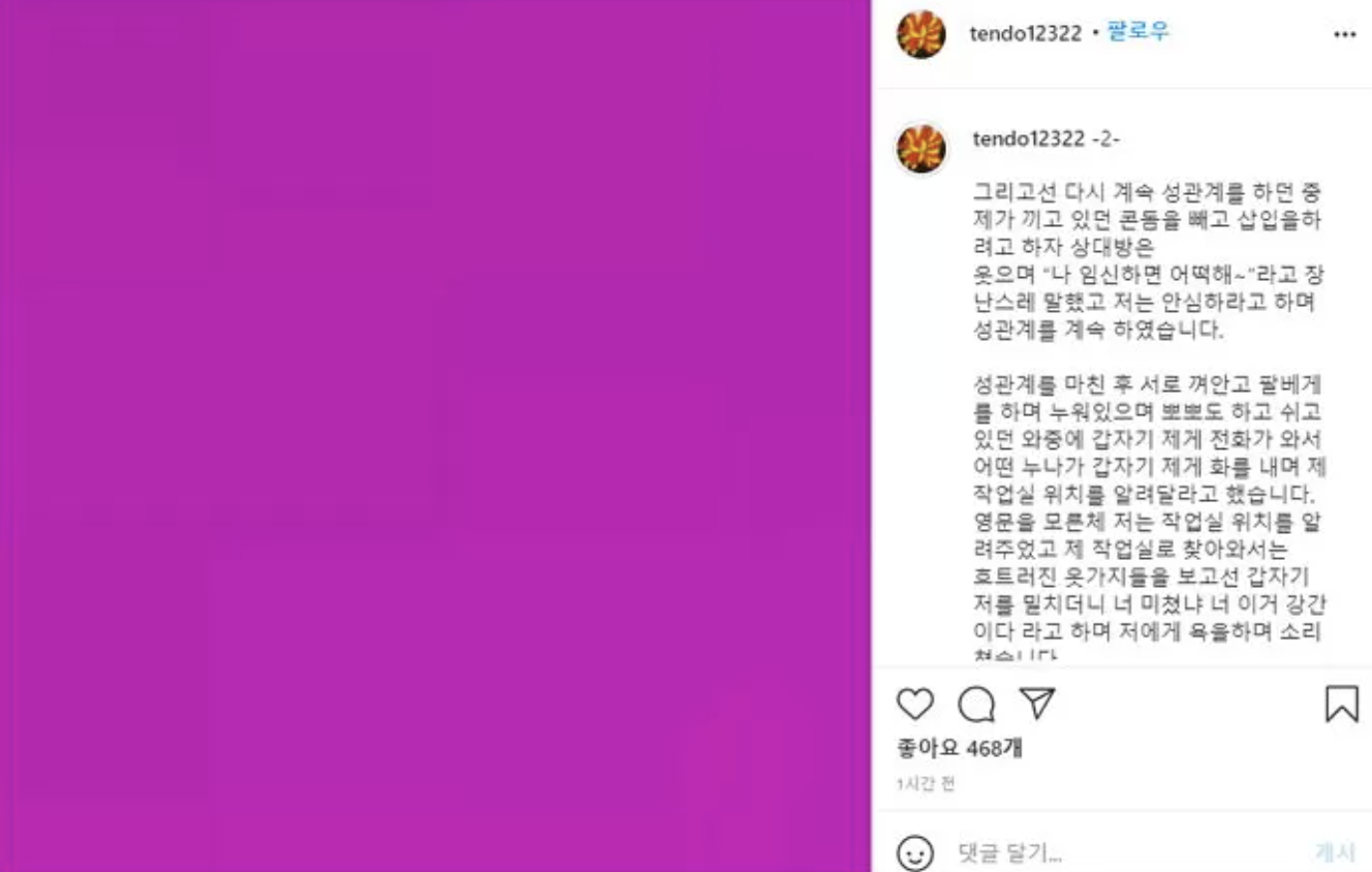 21일 강현은 자신의 SNS에 성폭행 혐의를 부인하며 당시 상황을 자세하게 설명한 글을 게재했다.