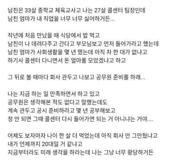 그는 “작년에 처음 만났을 때 식당에서 밥 먹고 남친이 나 데려다주고 간다고 부모님보고 먼저 들어가라고 했는데 남친 엄마가 사회생활 몇 년했는데 아직 차 한대가 없냐고 하기사 콜센터 다니면서 돈 얼마를 모았겠냐고 하고 그 뒤로 볼 때마다 회사 관두고 나보고 공무원 준비를 하래..”라고 전했다.