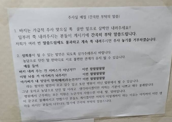 실제 사진 속 주사실 예절에는 “바지는 가급적 주사 맞으실 쪽 골반 밑으로 살짝만 내려주세요, 일부로 쭉 내려주시는 분들이 계시기에 간곡히 부탁 말씀드립니다. 저희가 여러번 말씀드림에도 불과하고 계속 쭉 내려주시면 주사 놓기를 거부하겠습니다”라는 충격적인 문구가 적혀 있었다.