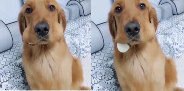 영상에는 양볼에 뭐가 들었는지 빵빵하게 차 있는 반려견의 모습이 담겼다.