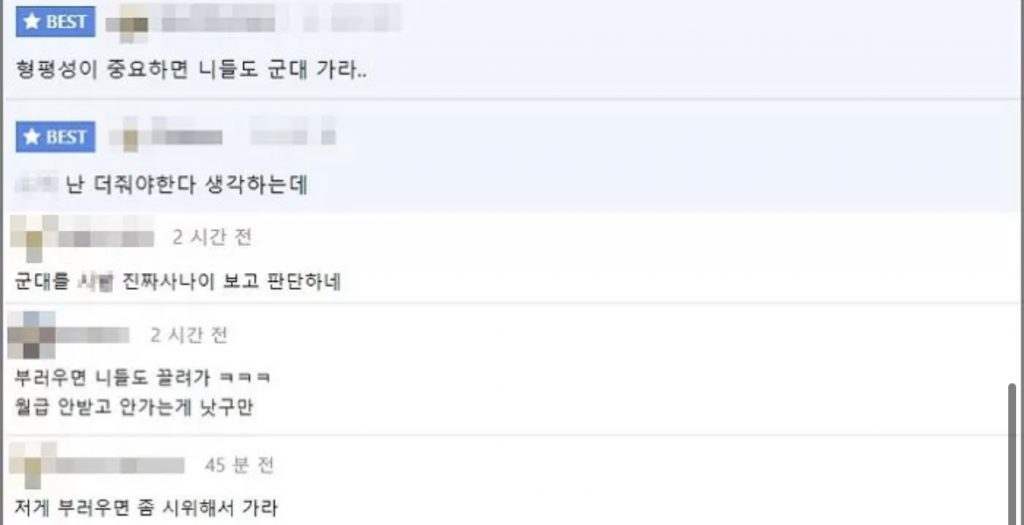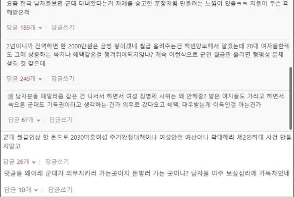 이들은 “(남성들은) 여성 징병제 (만들라는) 시위는 왜 안 해 주냐”, “군대가 의무 지키러 가는 곳이지 돈 벌러 가는 곳인가. 남자들 아주 보상 심리에 가득 차 있다”는 등 군 입대에 대한 비판적인 반응을 내보였다고 한다.