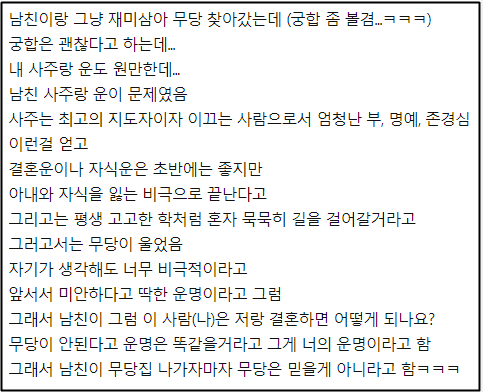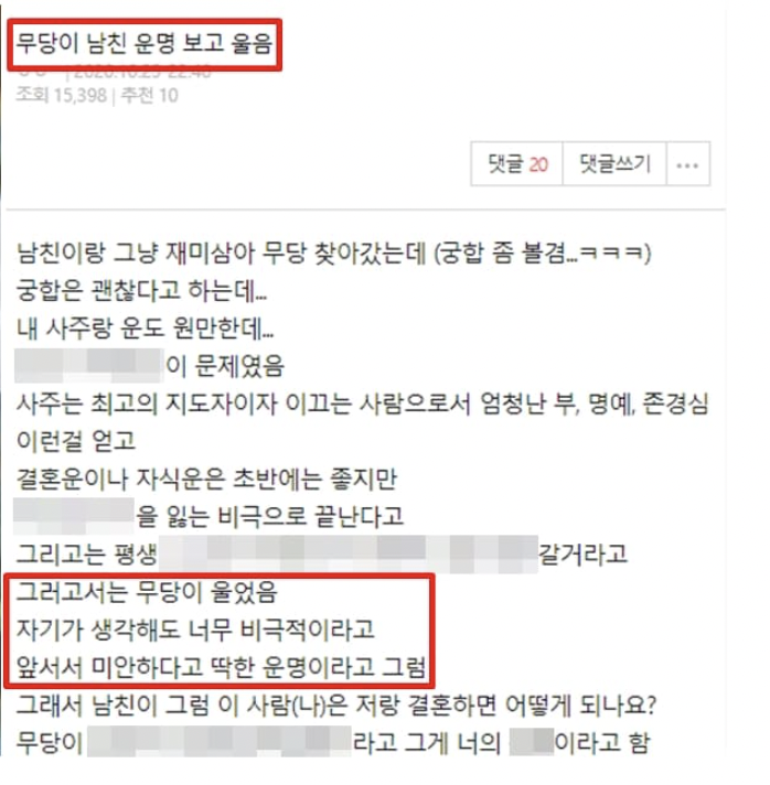 해당 게시글을 올린 작성자 A씨는 “무당이 남친 운명 보고 울음”라는 제목의 글로 많은 이들의 관심을 끌었다.