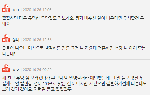 무당에게 “그래서 남자친구와 결혼을 하면 어떻게 되나”라고 질문을 했고, 무당은 “안 된다. 운명은 똑같을 거다. 그게 너의 운명이다”라고 답했다.