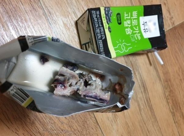 이상하게 느낀 두유를 상단 부분을 잘라서 확인한 A씨는 눈을 의심하며 큰 충격을 받았다.