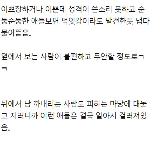 이쁘장하거나 이쁜데 성격이 쓴소리 못하고 순둥순둥한 애들보면 먹잇감이라도 발견한듯 냅다 물어뜯음..
