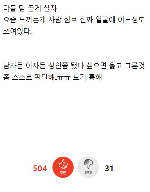남자든 여자든 성인쯤 됐다 싶으면 옳고 그른것 좀 스스로 판단해..ㅠㅠ 보기 흉해