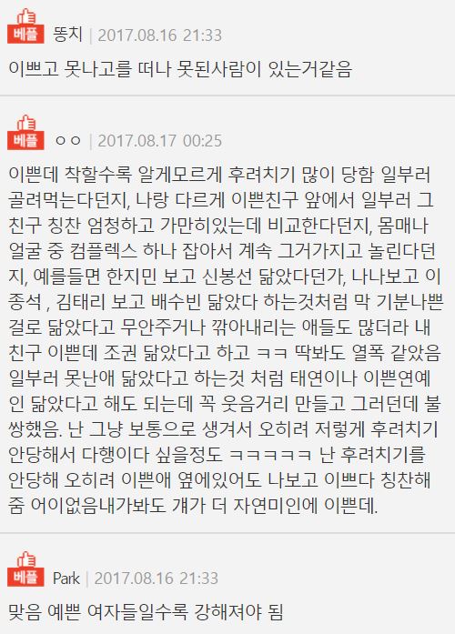 작성자는 “일부러 예쁜 애들에게만 못 되게 구는 것은 보기 안 좋다며 마음을 곱게 먹자”면서 글을 마쳤다.