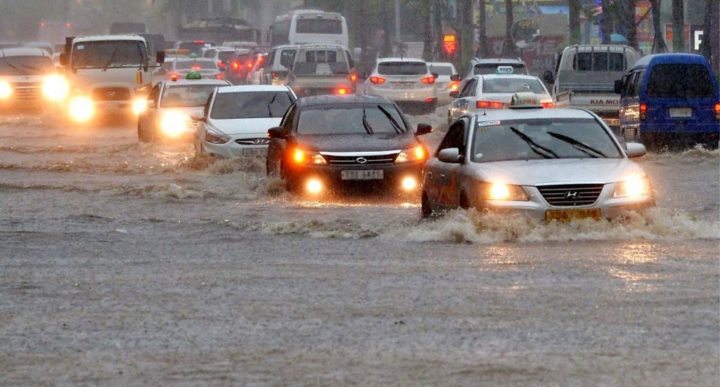 도로에서 앞서 가는 차를 기준으로 수위를 살피며 운행해야 한다. 바퀴가 절반 넘게 물에 잠기면 우회도로를 이용하는 것이 좋다.
