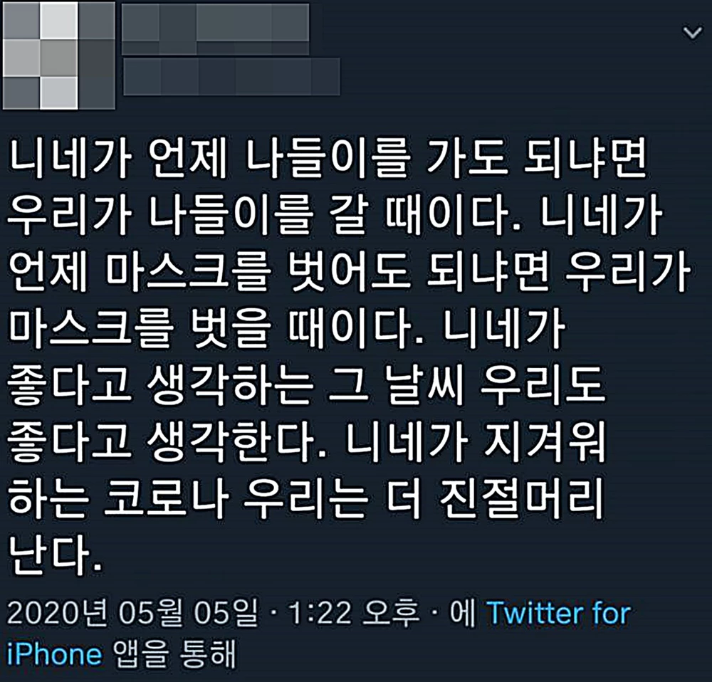 내용은 “너희(사람들)가 언제 나들이를 가도 되냐면 우리(의료진)가 나들이를 갈 때다. 너희가 언제 마스크를 벗어도 되냐면 우리가 마스크를 벗을 때다. 너희가 좋다고 생각하는 그 날씨 우리도 좋다고 생각한다. 너희가 지겨워하는 코로나, 우리는 더 진절머리난다”라고 써 있었다.