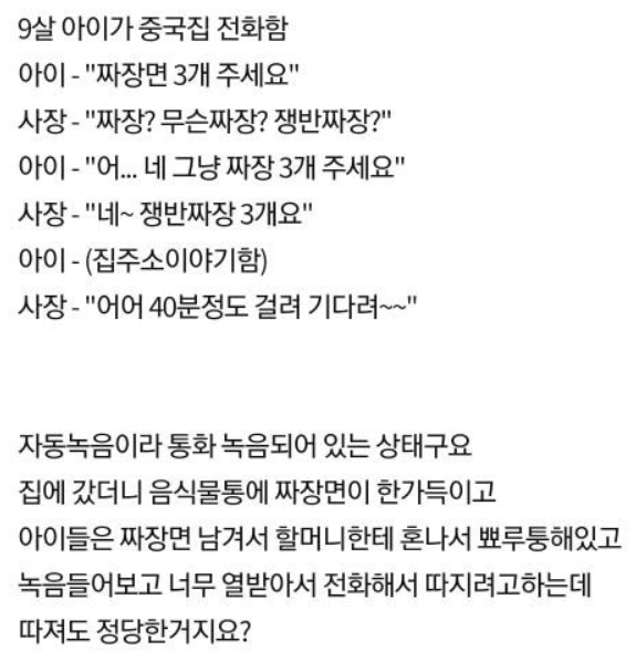아이는 “그냥 일반 짜장 3개 주세요”라고 답했지만 이에 중국집 사장은 “네 쟁반 짜장 3개요”라며 답했다.