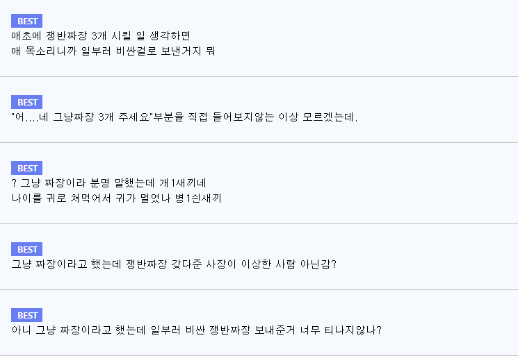 글쓴이는 관련된 대화 내용을 게시했는데, 아이는 짜장면 3개를 주문하자 중국집 사장은 “짜장? 무슨 짜장? 쟁반 짜장?”라며 되물었다.
